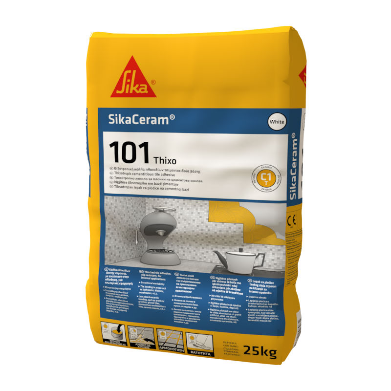 Η SikaCeram®-101 Thixo είναι ενός συστατικού, τσιμεντοειδής λευκή κόλλα πλακιδίων, μειωμένης ολίσθησης, με επιλεγμένα αδρανή, ειδικά πρόσμικτα και πολυμερή.